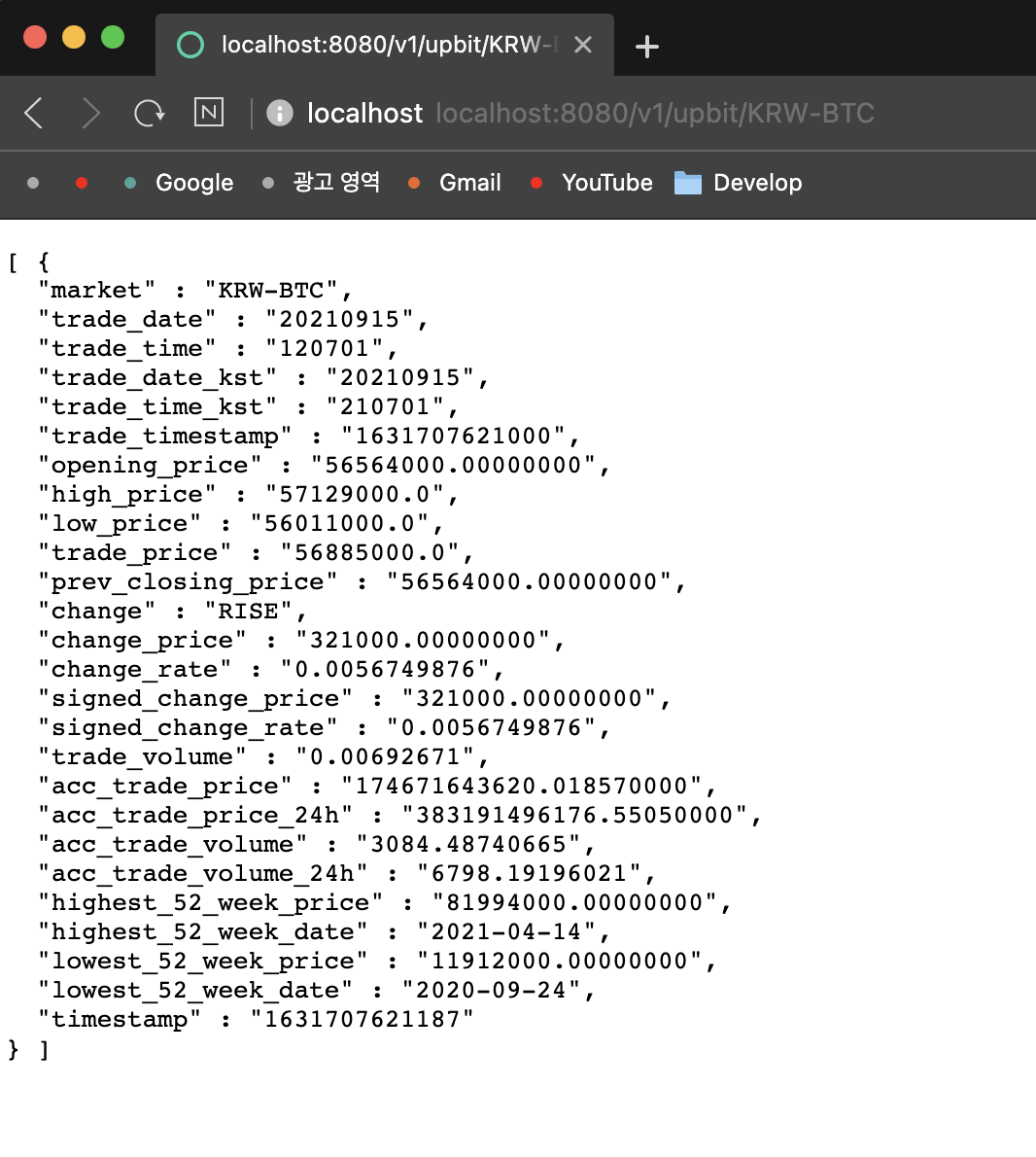 빌드 후 호출 테스트를 해보면 아래와 같은 정상적으로 시세 조회가 가능한 것을 확인 할 수 있다.