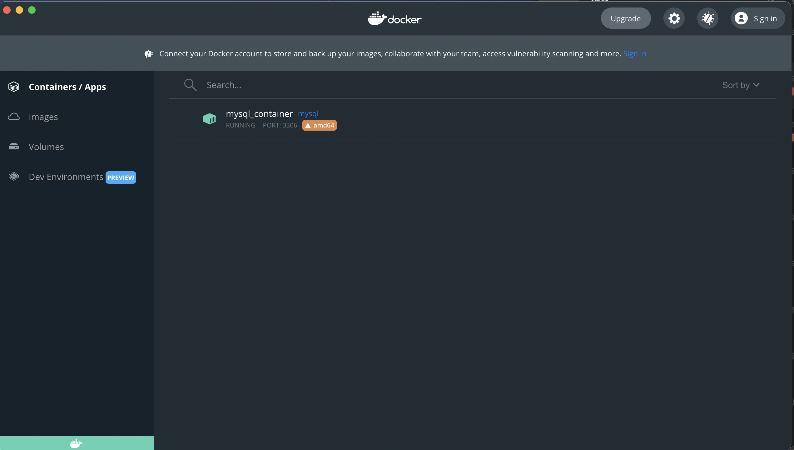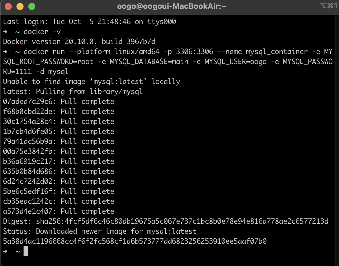 $ docker run --platform linux/amd64 -p 3306:3306 --name mysql_container -e MYSQL_ROOT_PASSWORD=root -e MYSQL_DATABASE=main -e MYSQL_USER=oogo -e MYSQL_PASSWORD=1111 -d mysql