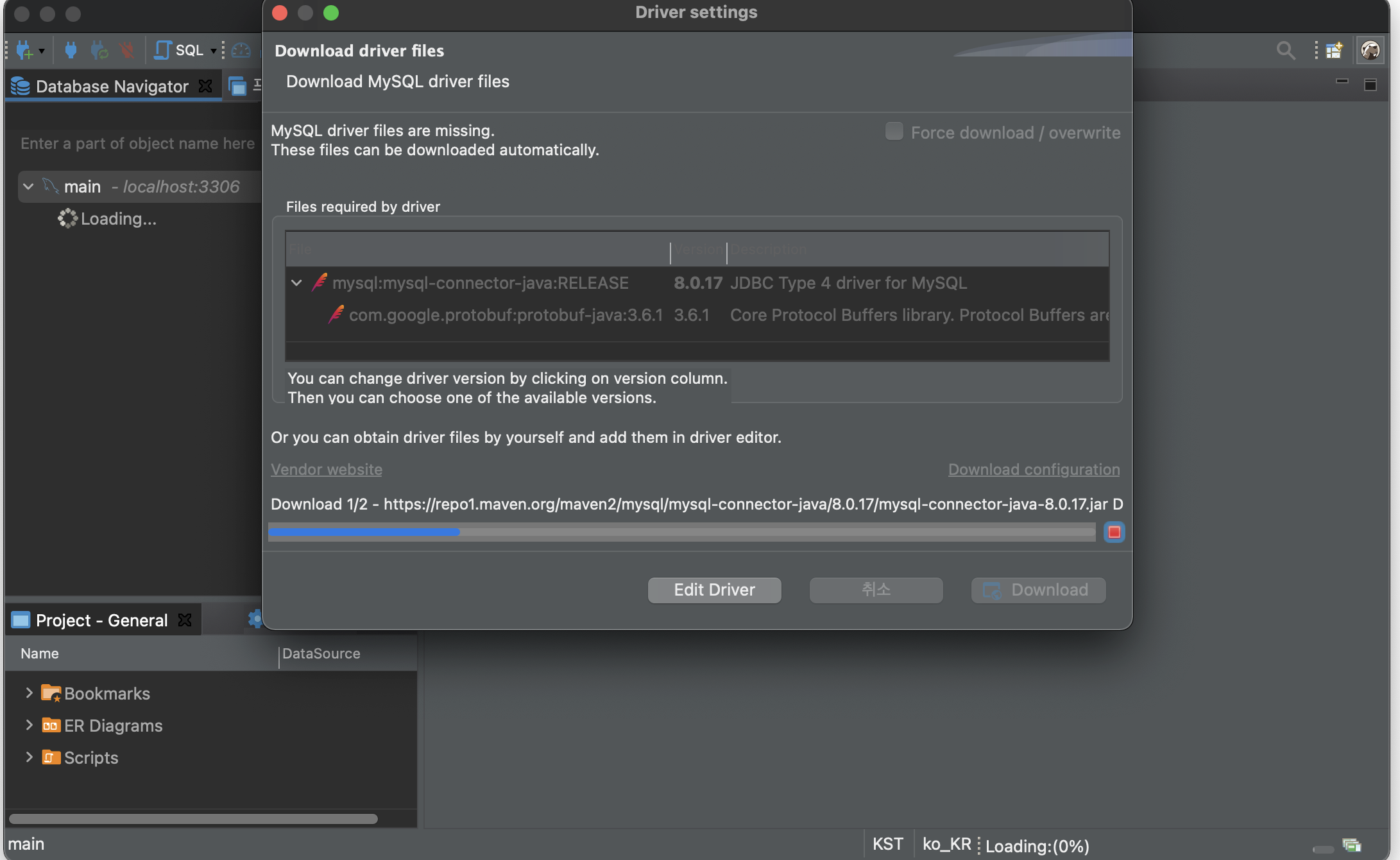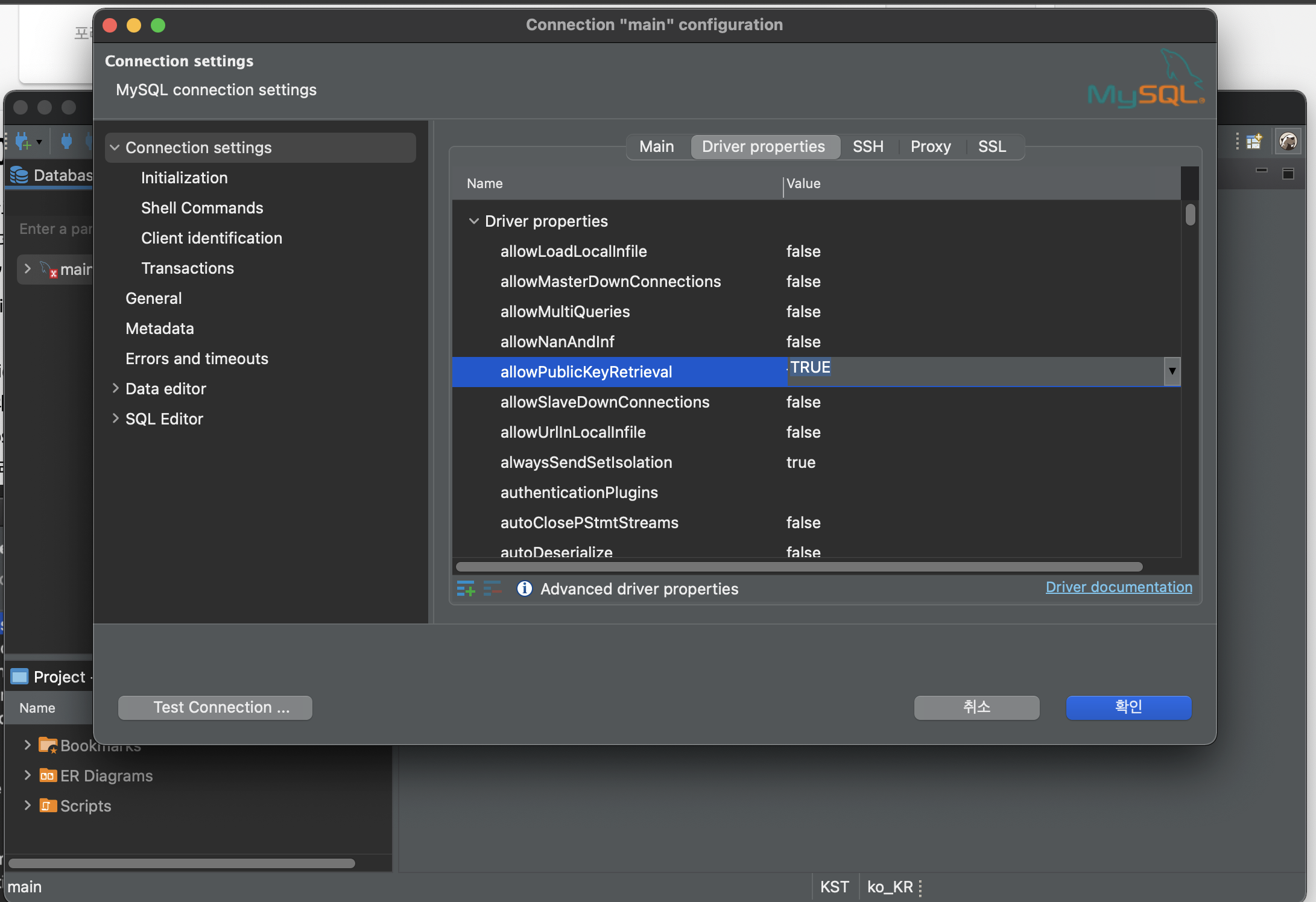 드라이버 프로퍼티스 탭에서 allowPublicKeyRetrieval을 true로 변경해줍니다.