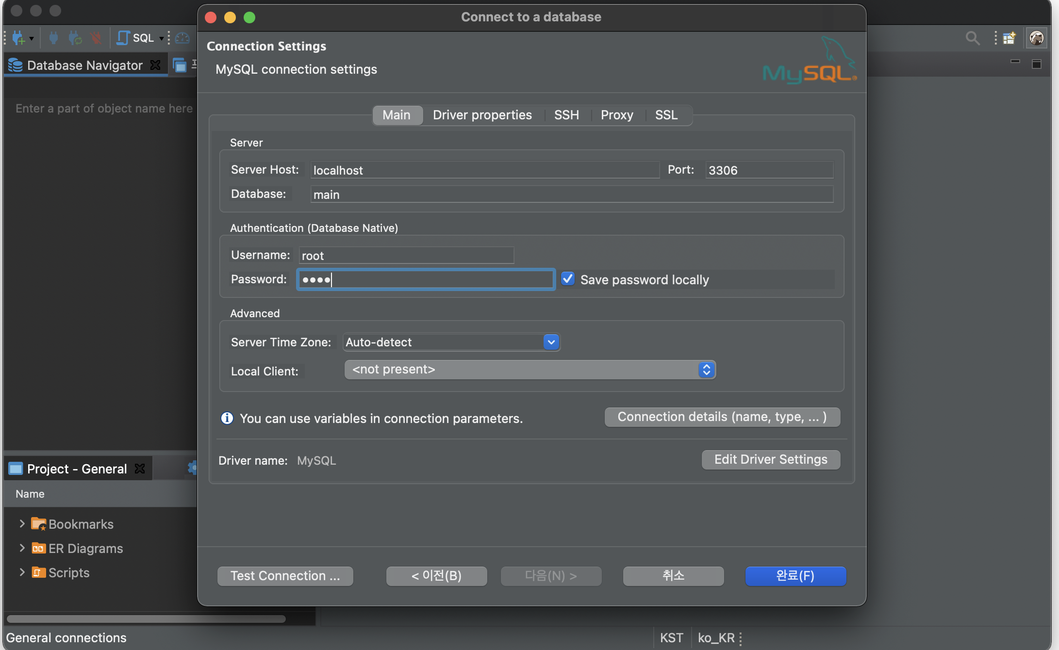 앞서 설정한 db명과 root비밀번호를 입력해 설정해줍니다. 그리고 완료버튼을 누릅니다.
