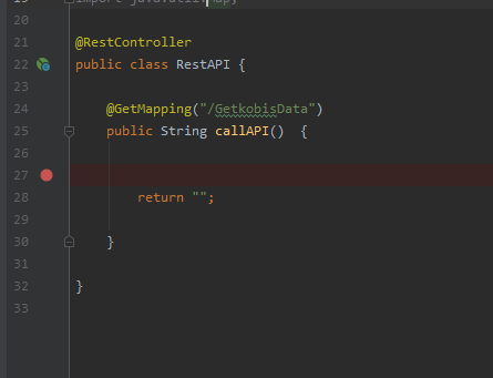 class명 위에는 @RestController, 메소드 위에는 @GetMapping("GetkobisData") 어노테이션을 추가해줍니다.