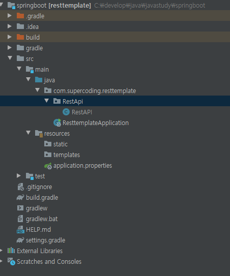 아래는 Resttemplate 테스트를 위해 아래 프로젝트 구조와 같이 RestAPI.java파일을 하나 생성합니다.
