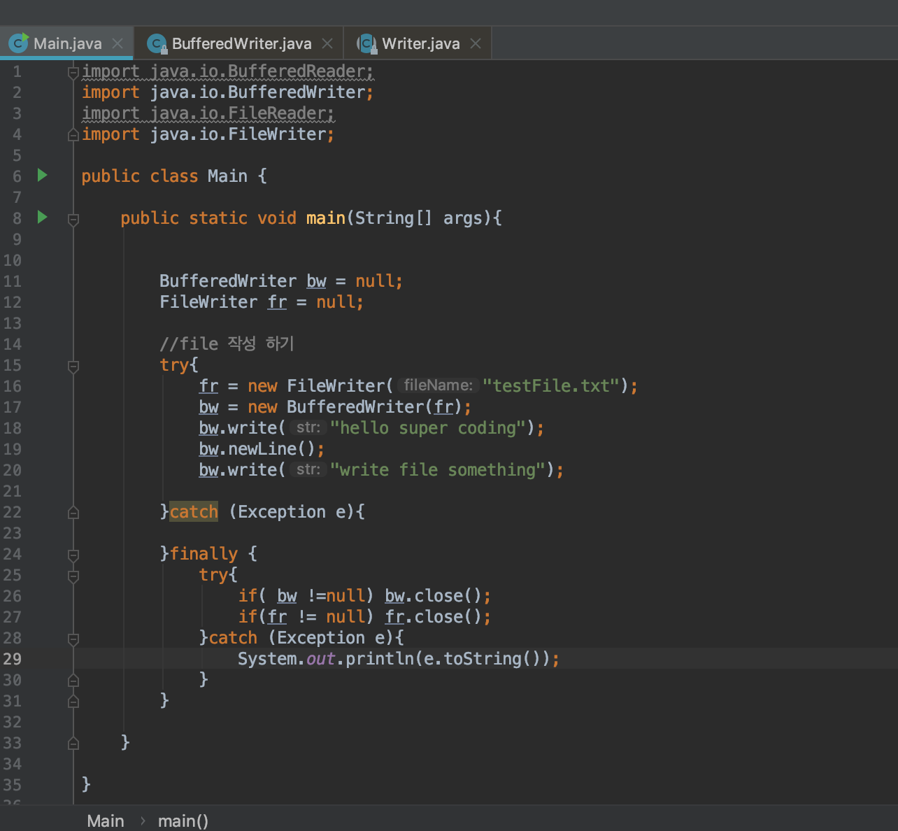 파일 쓰기를 위한 bufferdWriter , FileWriter 객체를 생성 하고, try catch의 마지막 finally block에서