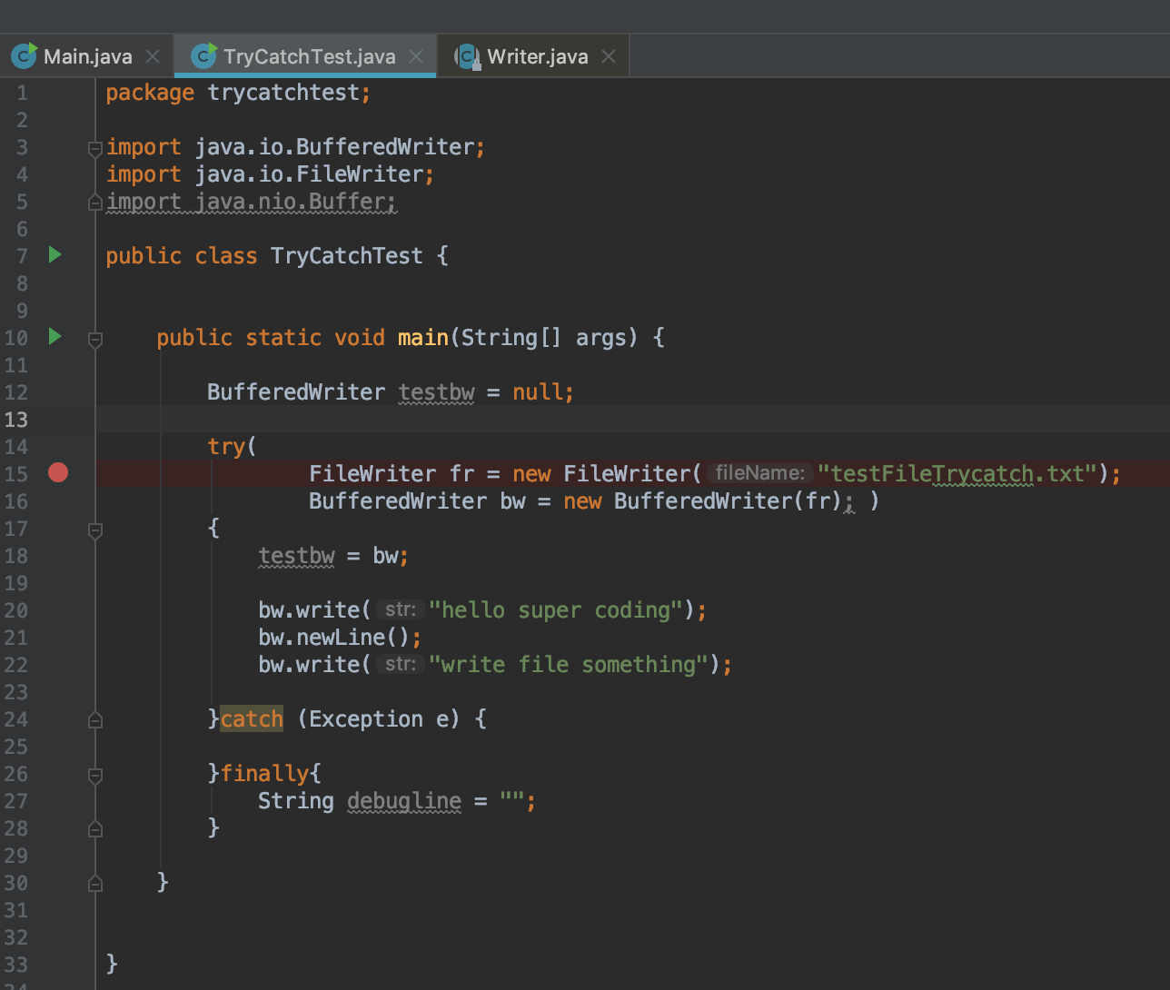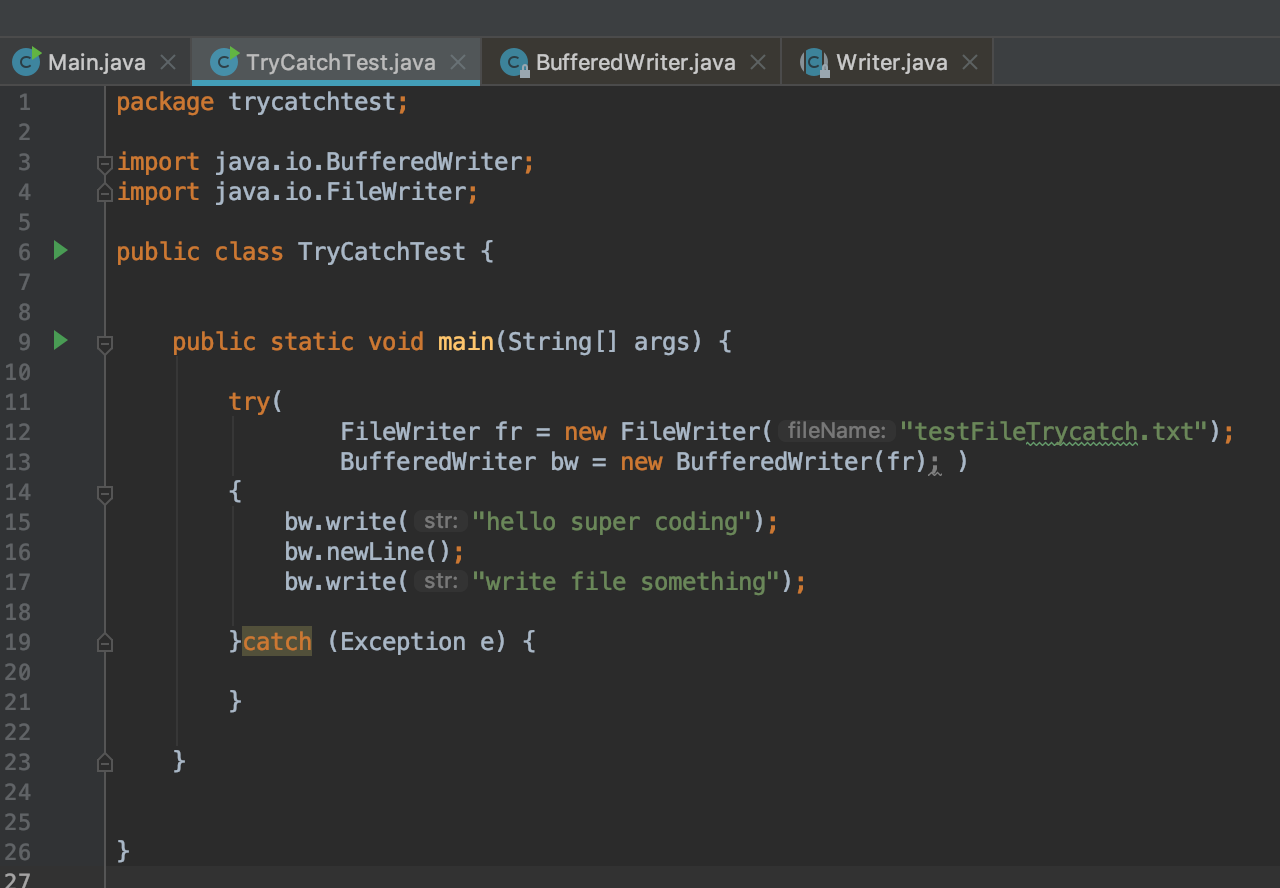 testbw 라는 BufferedWriter 객체를 Try block 바깥에 생성하고