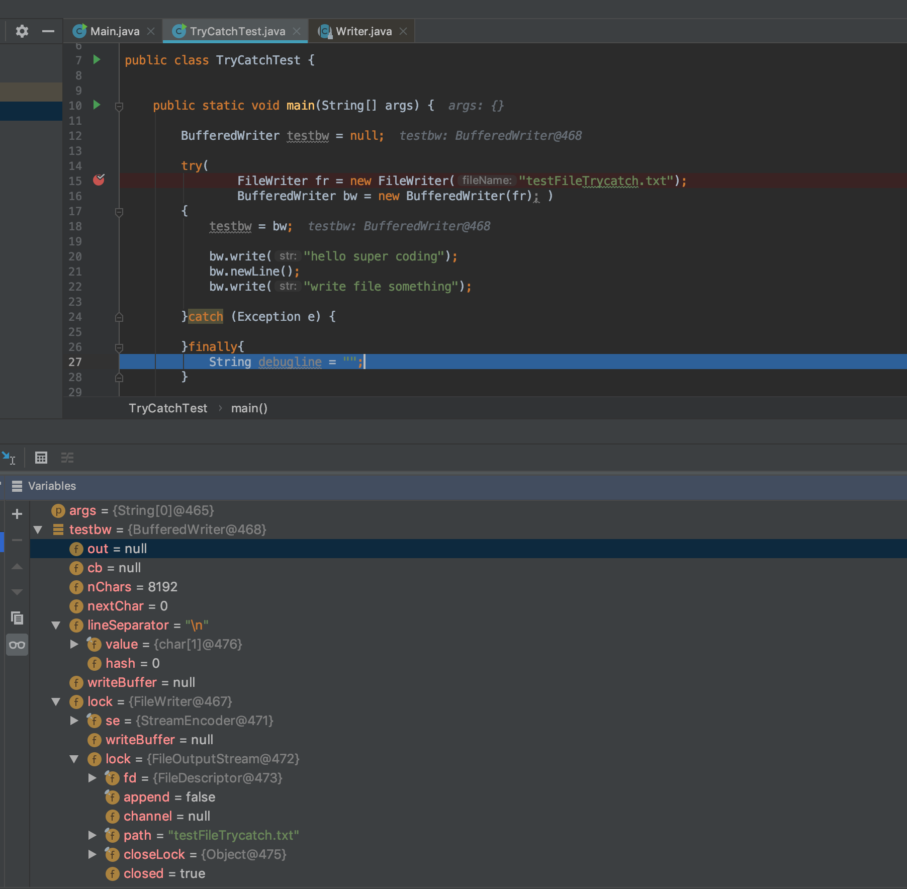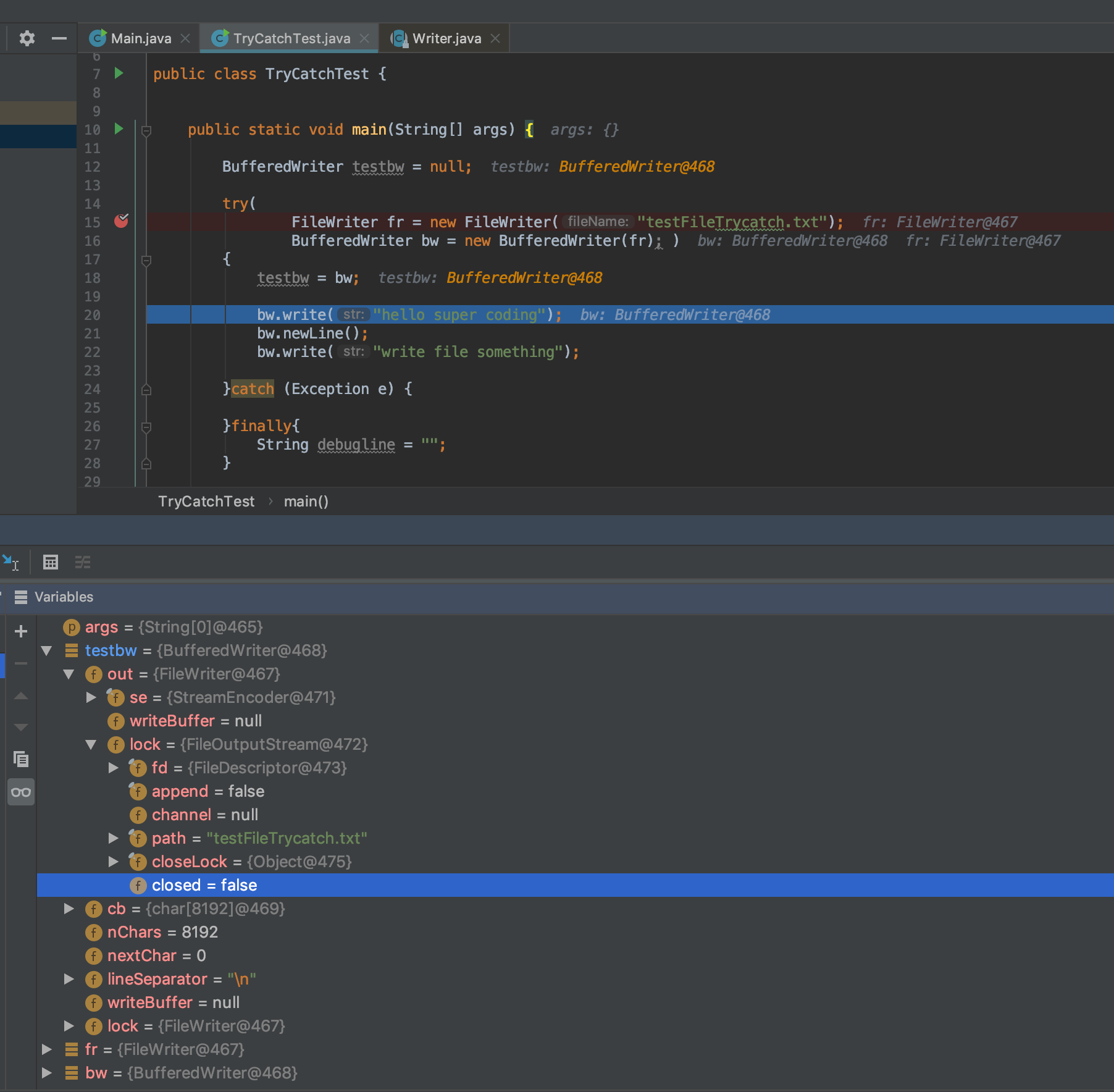 20번 라인까지 실행을 하면 testbw객체가 열려있는(close == false ) 상태임을 알 수 있습니다.