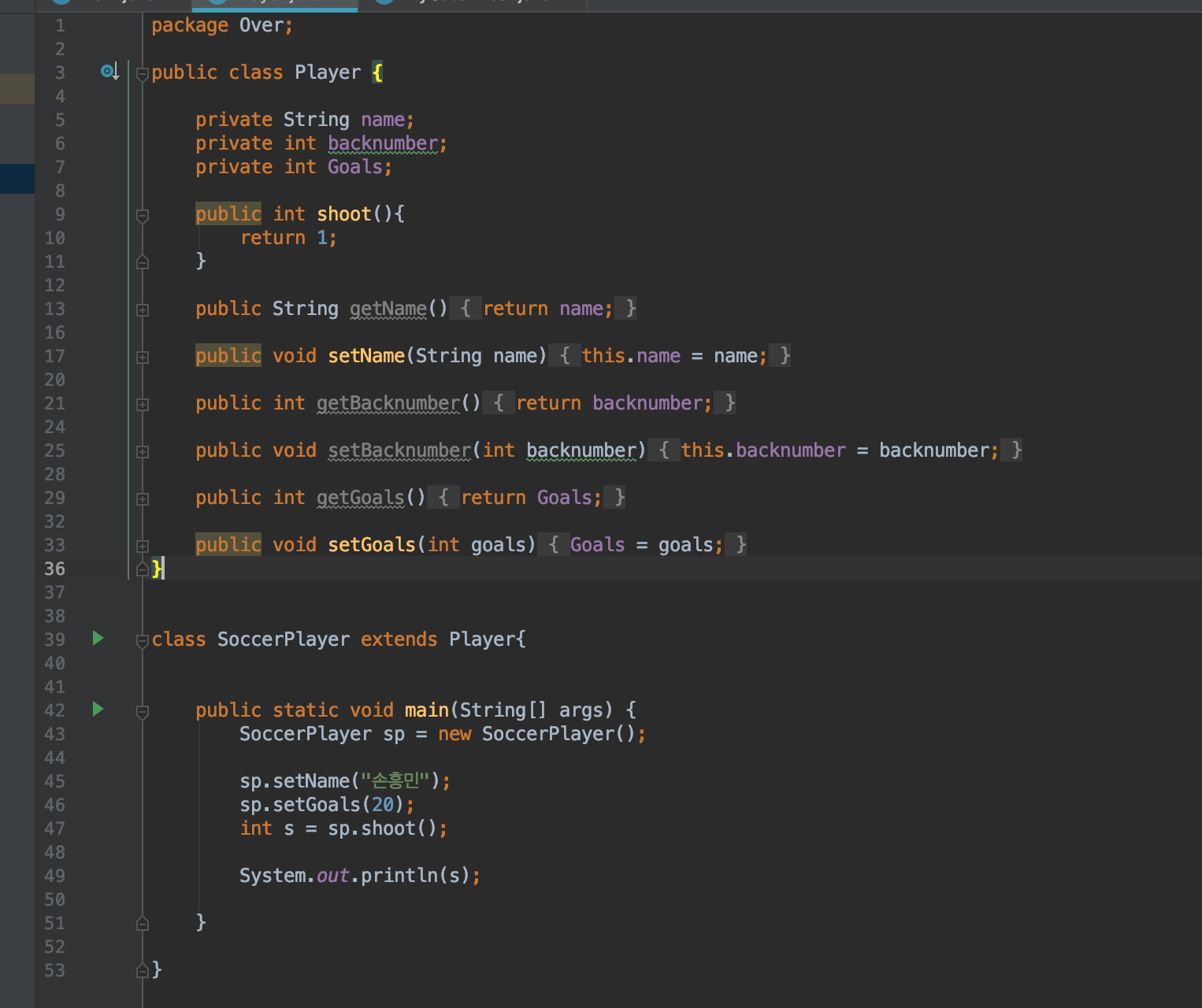 아래와 같이 Player 클래스와 SoccerPlayer 클래스를 생성했습니다. 두 클래스는 서로 상속관계입니다.