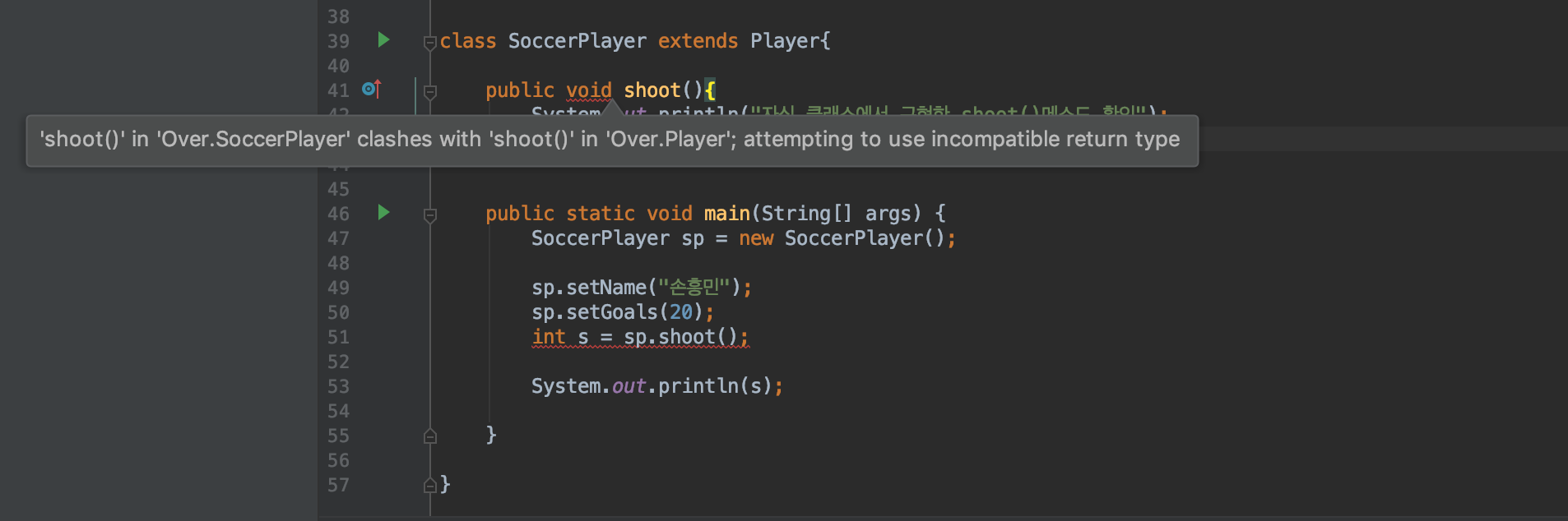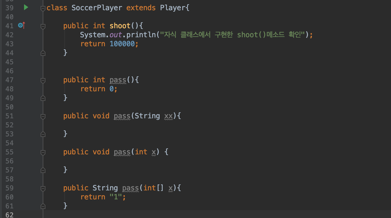 SoccerPlayer 객체에서 shoot() 메소드를 다시 정의해서 로직을 구현했습니다.