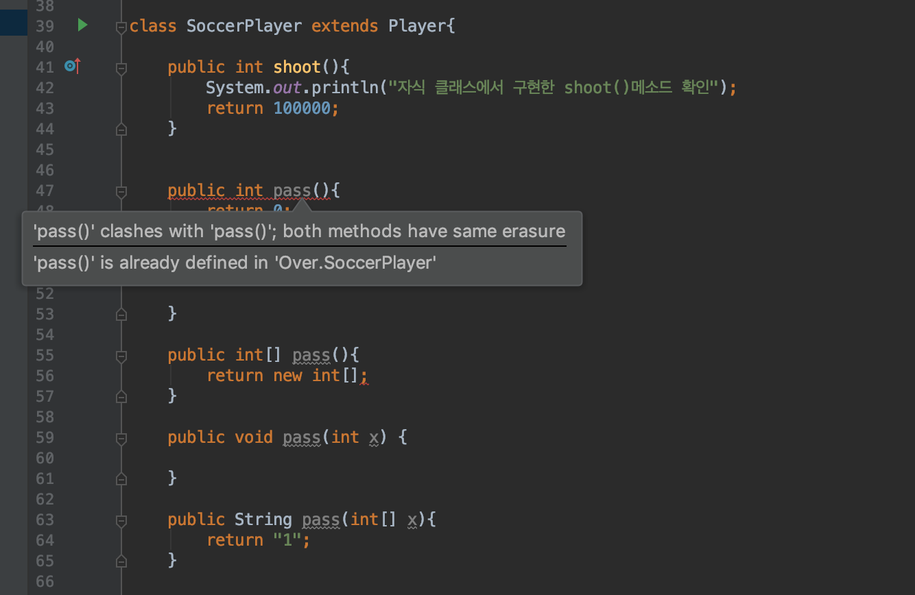 아래와 같이 pass()라는 동일 메소드명을 다양한 방식으로 정의해보았습니다.