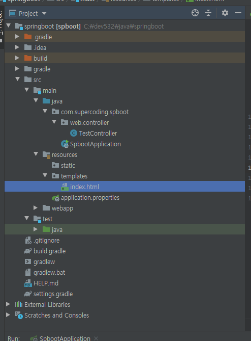 프로젝트 구조 templates 폴더 밑에 index.html 파일을 하나 생성,