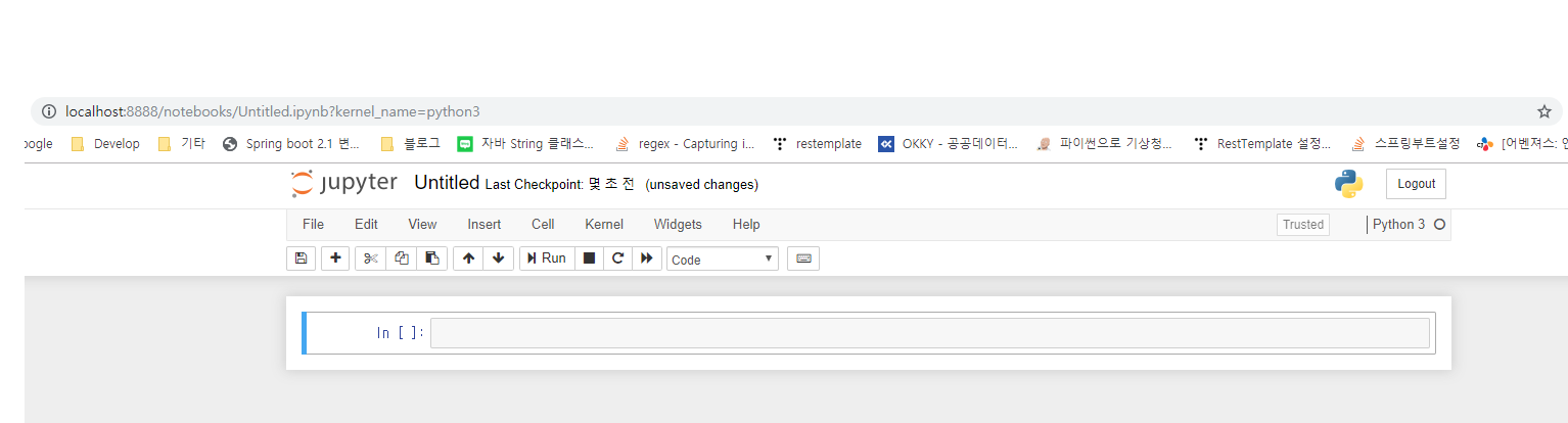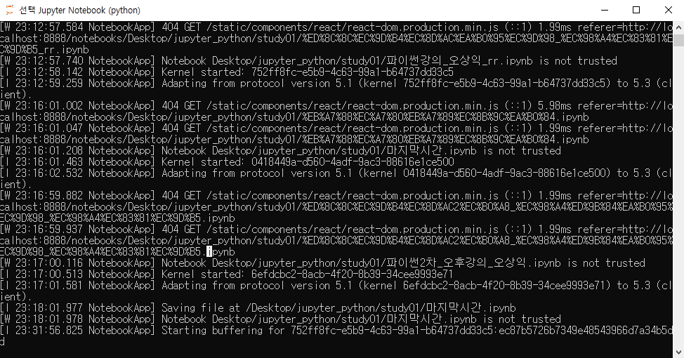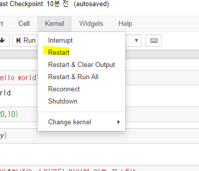 주피터 노트북 실행이 되지 않을 수 있습니다. 그럴 경우 아래와 같이 커널 리스타트를 한 번 해줍니다.