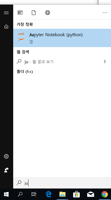 윈도우창을 누르고 jupy까지 검색하시면 jupyter notebook 실행 아이콘이 노출됩니다. 클립합니다.