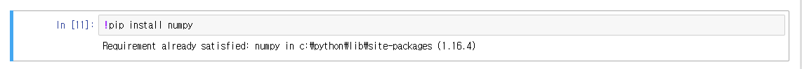 아래와 같이 numpy 라이브러리를 터미널과 동일한 command에 !(느낌표)만 붙여서 실행해주면 install 할 수 있습니다.
