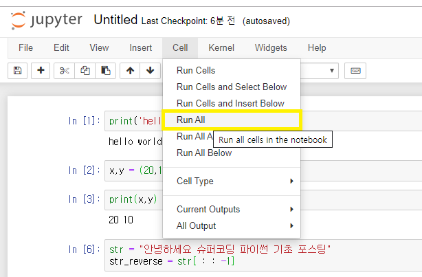 모든 코드를 실행하려면 Cell 탭을 클랙해 Run all을 눌러주시면 됩니다.