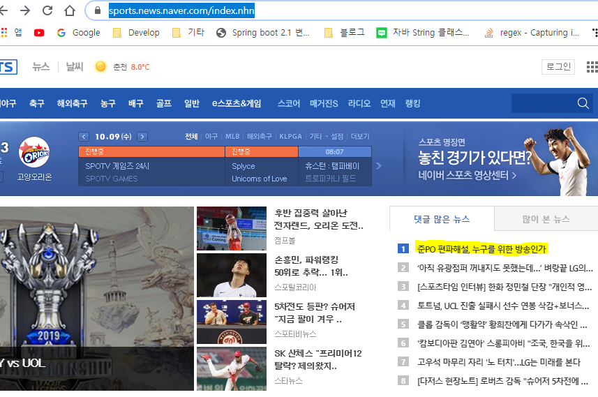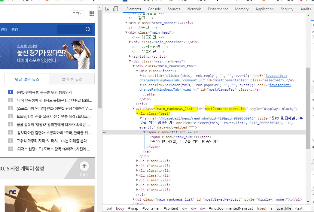 테스트 케이스로 네이버 스포츠 메인화면 -> 댓글 많은 뉴스 -> 1위 기사 제목을 가져와 보도록 하겠습니다.