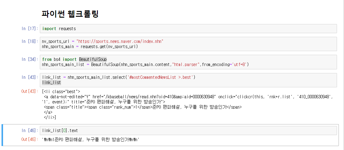 link_list[0].text 를 실행해보면 목표했던 댓글 많은 뉴스 1위 기사 제목을 가져오게 되었네요.