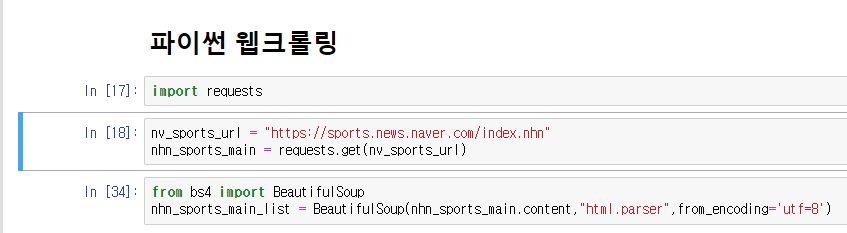 ●.크롤링할 대상 url인 https://sports.news.naver.com/index.nhn을 변수하나를 만들어 저장해줍니다.
