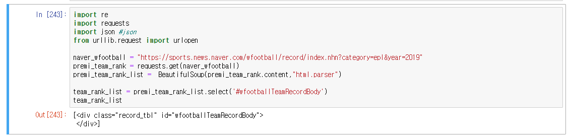 | [python] 파이썬 웹 크롤링 - 3 : 프리미어리그 팀 순위 (0) | 2019.10.10 |