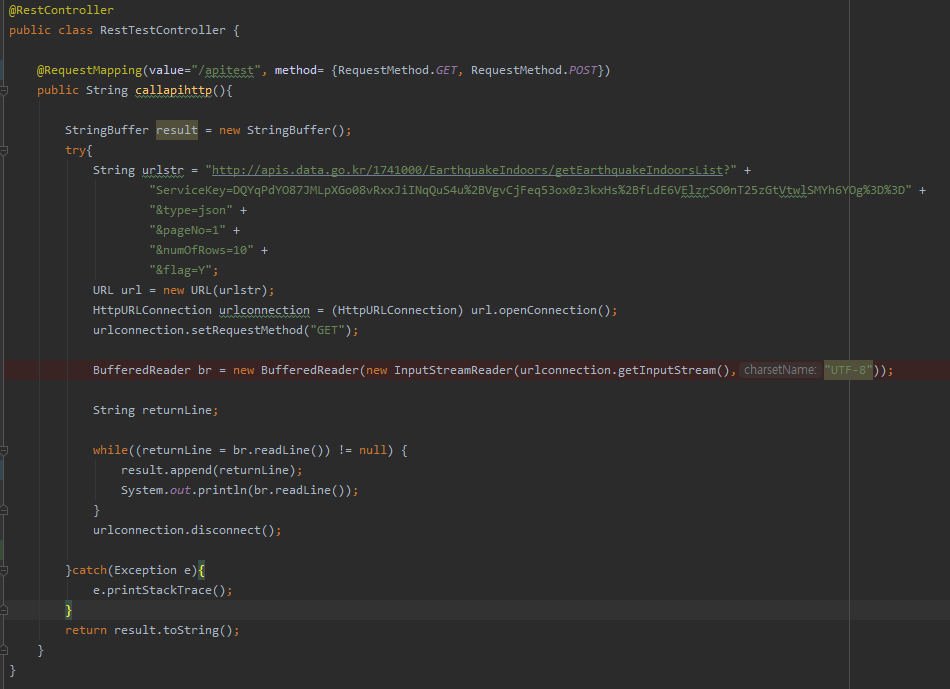 Controller 영역은 기존 공공데이터 pai예제와 동일합니다.