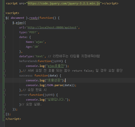 dataType : 요청하는 url의 리턴타입을 지정해줍니다. HashMap or List -> json, String -> text