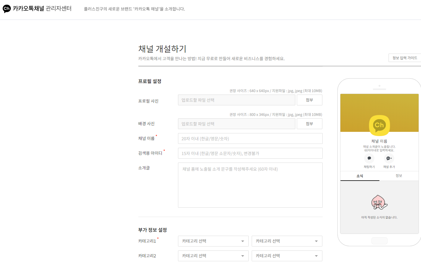 신청에 앞서 카카오톡 플러스친구가 하나 있어야합니다.