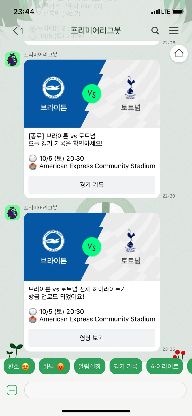 제가 잘 사용하고 있는 카카오톡 채널(플러스친구) 프리미어리그봇입니다.