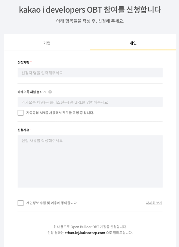 먼저, 카카오톡 오픈빌더를 신청해봅시다.