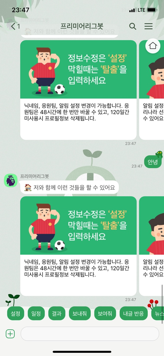 프리미어리그봇 내부 UI는 일반 말풍선만 있는 것이 아닌 이미지도 있고 조그만 말풍선 UI도 보입니다.