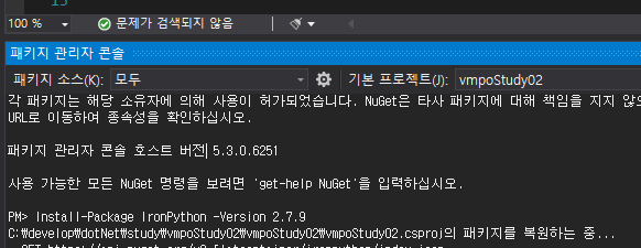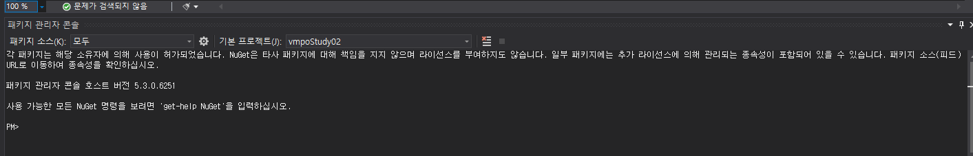 패키지 관리자 콘솔을 클릭하면 visual studio 하단에 아래 화면이 노출됩니다.