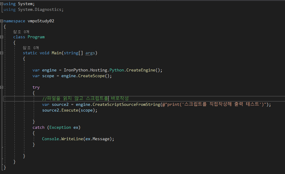 var source2 = engine.CreateScriptSourceFromString(@"print('스크립트를 직접작성해 출력 테스트')");