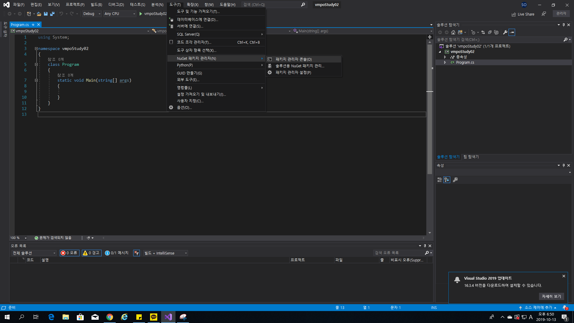 도구 -> nuget패키지 관리자 -> 패키지 관리자 콘솔을 클릭합니다.