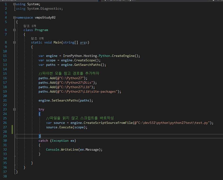 paths.Add()를 통해 python2.7 버전 관련 라이브러리가 저장되어 있는 path를 추가해줍니다.