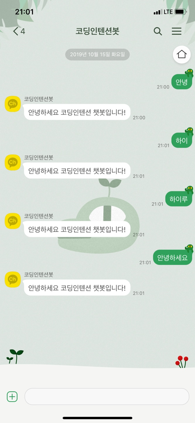 채팅방으로 이동해 그럼 사전에 등록한 패턴인 인사말을 날려보겠습니다.