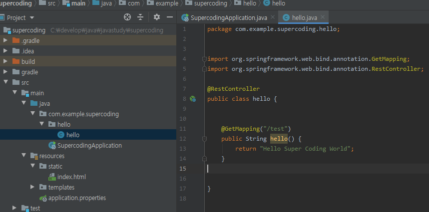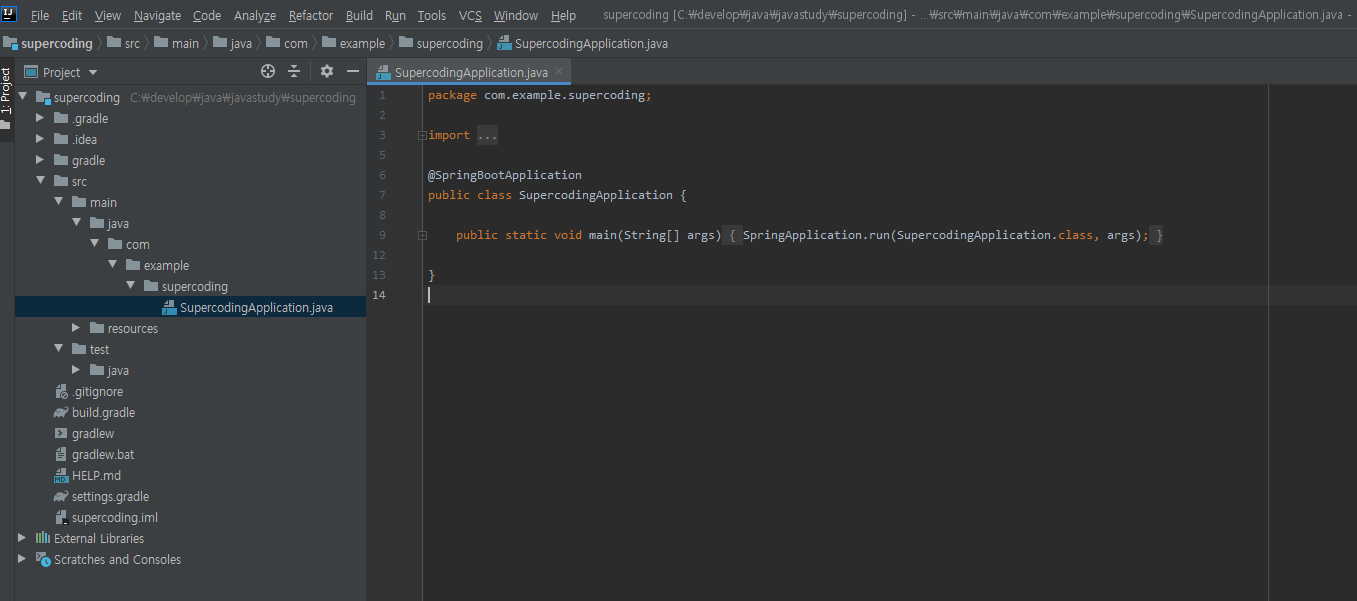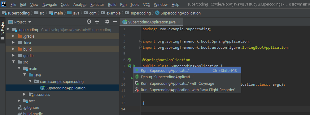 @Run 'SupercodingApplicati..'를 클릭해준다.(다른 패키지명이라면 해당 영역을 클릭합니다)