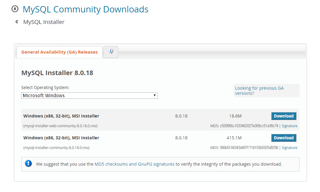 Select Operating System: Select Operating System… Microsoft Windows Select OS Version: All Windows (x86, 32-bit) Windows (x86, 32-bit), MSI Installer 8.0.18 18.6M (mysql-installer-web-community-8.0.18.0.msi) MD5: c509966c1033462027a009cc51a98c74 | Signatur