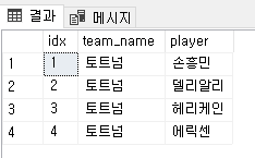 insert into #TEMP_TABLE values(4,'토트넘','에릭센')