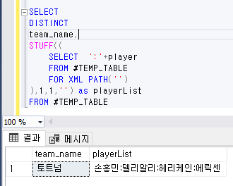 결론적으로, STUFF는 위 FOR XML PATH에서 제일 앞에 붙는 구분자 값을 삭제하는데 활용하게 됩니다.