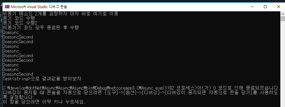 아래 코드를 실행하면, Doasync() 비동기 메소드의 return값을 가져올 수 있는 것을 확인 할 수 있습니다.