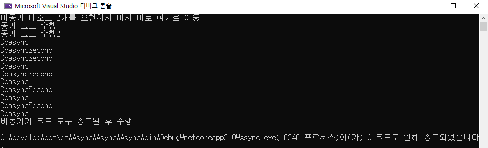 Doasync() ,DosyncSecond()를 먼저 요청했음에도, 비동기 메소드이기 때문에 바로 다음라인들의 로직이 수행되게 됩니다. 그리고, await키워드를 메소드 바깥에 설정해 두었기 때문에 비동기 메소드 2개가 모두 종료될때까지 기다린 후