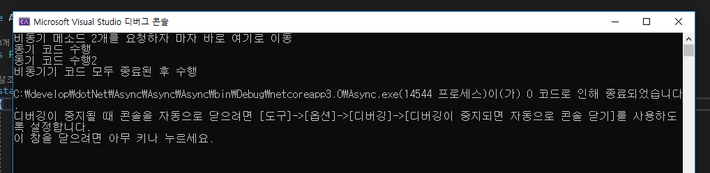최종 모두 수행되면 마지막 Consle.WriteLine()함수를 실행하며 프로그램이 종료되게 됩니다.